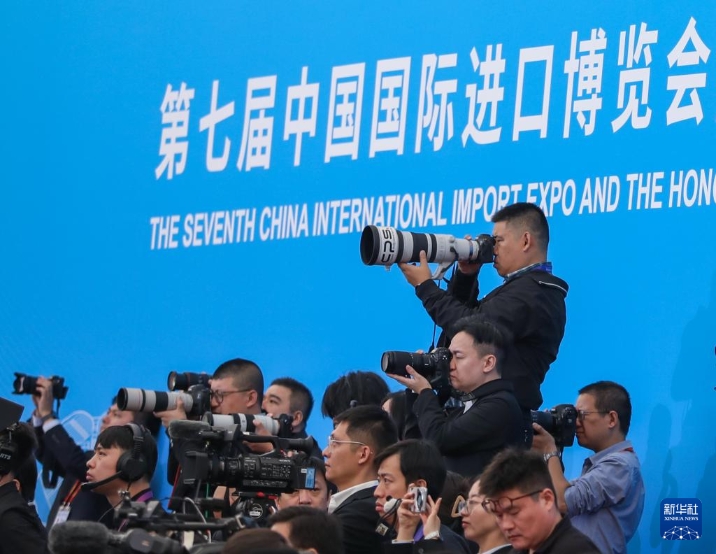 11月5日,第七届中国国际进口博览会暨虹桥国际经济论坛开幕式在国家会展中心(上海)举行。这是媒体记者在开幕式上采访。