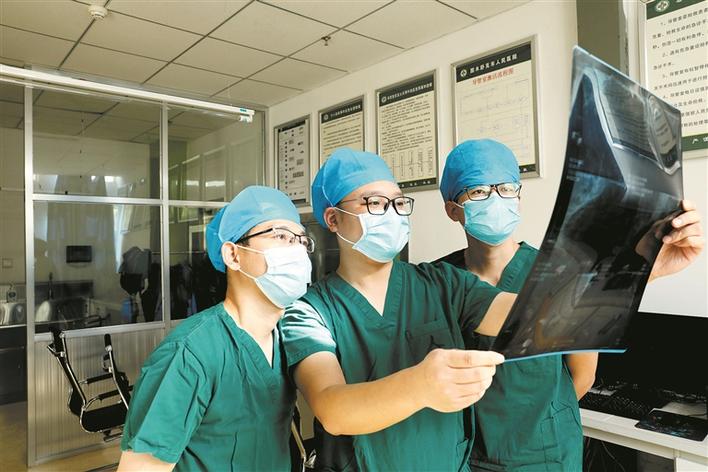 广东省援疆医生李诗成(中)与同事一起分析冠状动脉造影片(资料图片)。自2020年以来,广东省累计投入2亿元资金开展对口医疗援疆工作,对三师图木舒克市进行从软件到硬件的全方位支援。何润江 摄