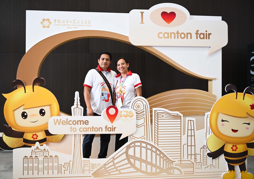 2024年10月15日,来自秘鲁的采购商在广州举行的广交会上合影留念。