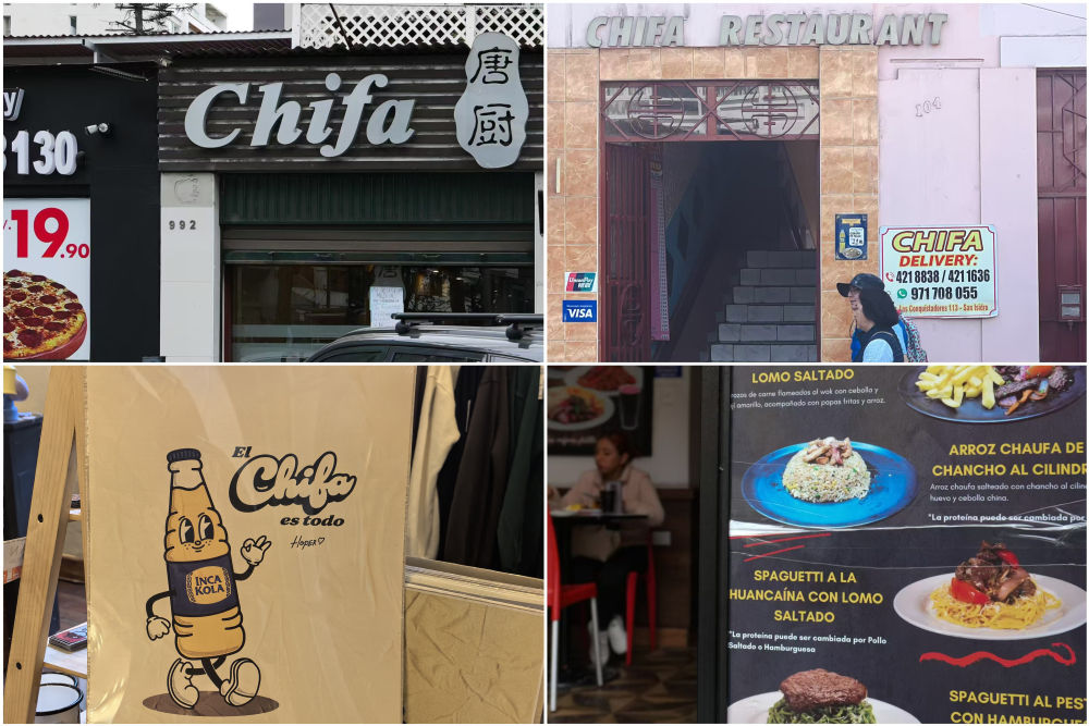 绵延不断的人文交流,让秘鲁的饮食带上了明显的中餐印记:中餐馆在秘鲁被称作“Chifa”(吃饭)(左上、右上)。炒饭(Chaufa)作为常规食物,登上了大多数当地餐馆的菜单(右下)。Chifa一词,还被利马的年轻画家化用为文化符号,与本土饮料“印加可乐”一起融入到艺术创作中(左下)。