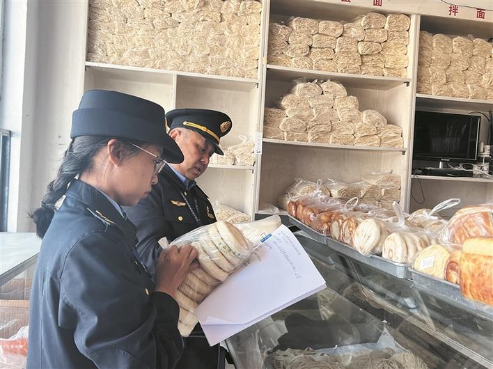 11月25日,十三师新星市市场监管综合行政执法支队的执法人员在仔细检查经营主体进货台账、原料采购渠道等关键环节。刘莎 摄