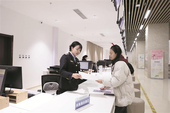 12月2日,在十二师市民服务中心市场监督管理局服务窗口,工作人员(左)在为办理营业执照的群众讲解办理流程。兵团日报常驻记者 冯晓玲 摄