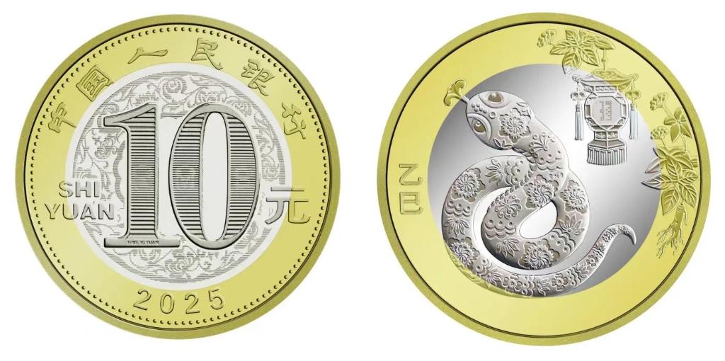 双色铜合金纪念币正面图案为“中国人民银行”“10元”字样,汉语拼音字母“SHIYUAN”及年号“2025”,底纹衬以团花图案。背面图案为中国传统剪纸艺术与装饰年画元素相结合的蛇形象,衬以花灯和人参图案,币面左侧刊“乙巳”字样。