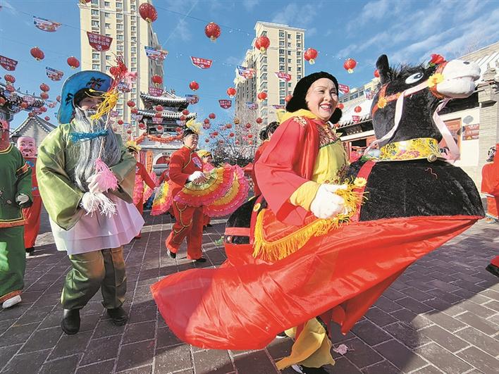 十二师一〇四团职工群众在老君庙景区进行社火表演(资料图片)。一〇四团将冰雪旅游与中华优秀传统文化相结合,持续挖掘团场“新、奇、特”冰雪文化资源,以“冰雪+”“节庆+”“民俗+”为载体,推动冬季文旅持续升温。李羚蔚 摄