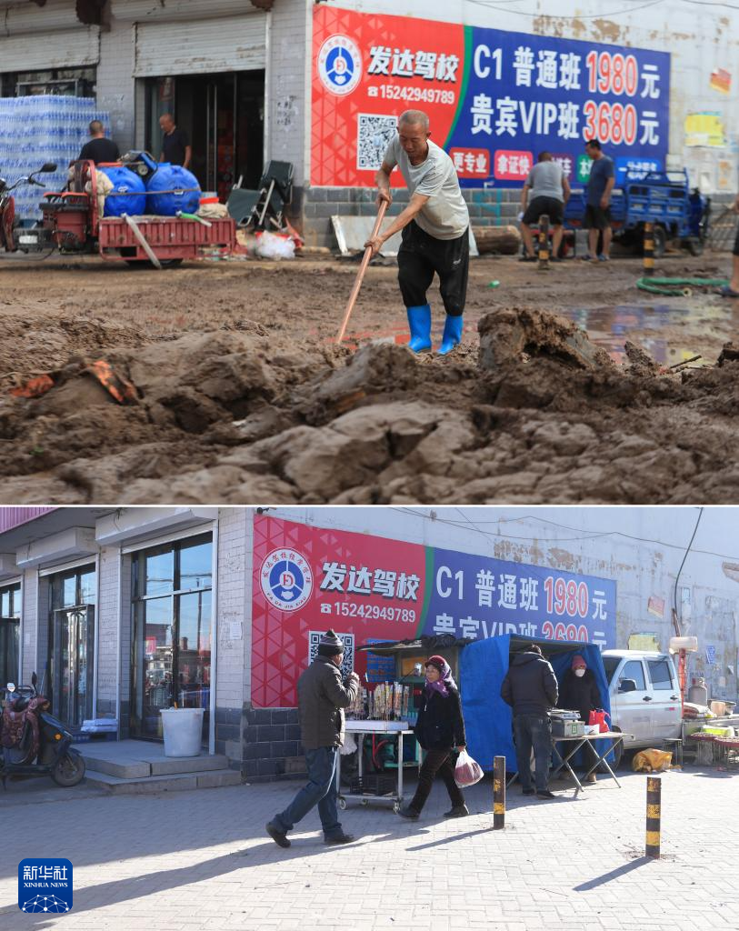 拼版照片:上图为8月21日拍摄的一名居民在辽宁省葫芦岛市建昌县黑山科乡清理道路淤泥(新华社记者杨青摄);下图为12月17日在同一地点拍摄的黑山科乡街市场景(新华社记者李钢摄)。今年8月,建昌县遭遇特大暴雨引发洪灾,黑山科乡杨树底下村受灾最重。