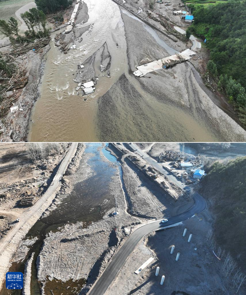 拼版照片:上图为8月21日拍摄的辽宁省葫芦岛市建昌县黑山科乡被冲毁的道路(无人机照片,新华社记者杨青摄);下图为12月17日拍摄的黑山科乡修复后的道路(新华社记者李钢摄)。今年8月,建昌县遭遇特大暴雨引发洪灾,黑山科乡杨树底下村受灾最重。