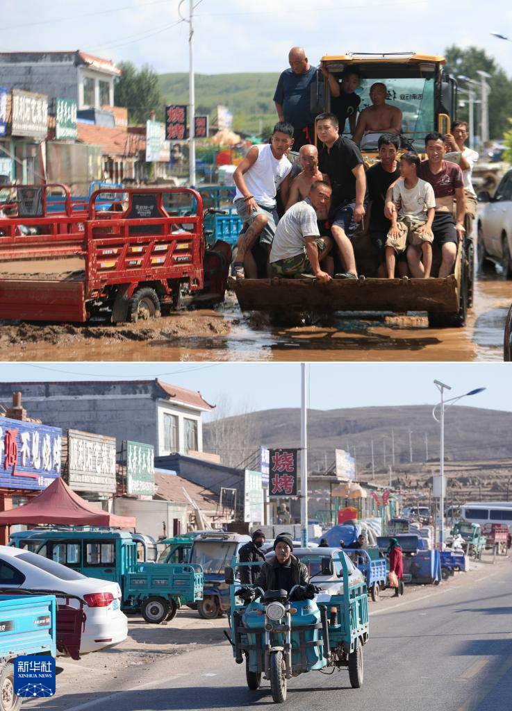 拼版照片:上图为8月21日拍摄的受灾居民在辽宁省葫芦岛市建昌县黑山科乡乘坐铲车转移(新华社记者杨青摄);下图为12月17日在同一地点拍摄的黑山科乡街市场景(新华社记者李钢摄)。今年8月,建昌县遭遇特大暴雨引发洪灾,黑山科乡杨树底下村受灾最重。