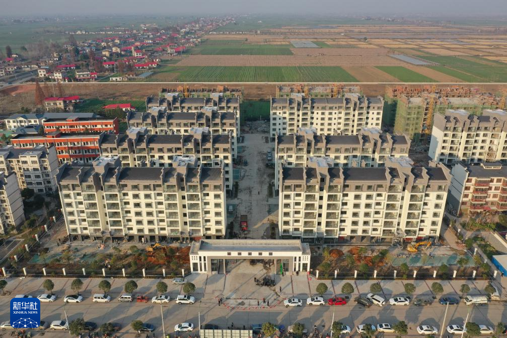12月18日在湖南省华容县团洲垸拍摄的建设中的受灾群众安置小区“团洲新村”(无人机照片)。今年7月,团洲乡团洲垸洞庭湖一线堤防发生决口,团洲乡绝大部分被淹。