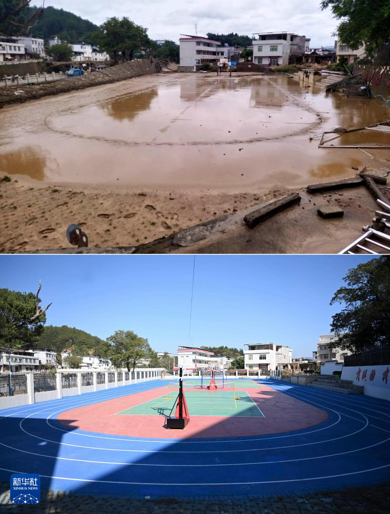 拼版照片:上图为6月20日在福建省龙岩市武平县中赤镇中赤中心小学拍摄的操场受灾照片;下图为12月17日拍摄的重建后的中赤中心小学操场。今年6月,中赤镇遭遇特大暴雨,7个村近9000人受灾。