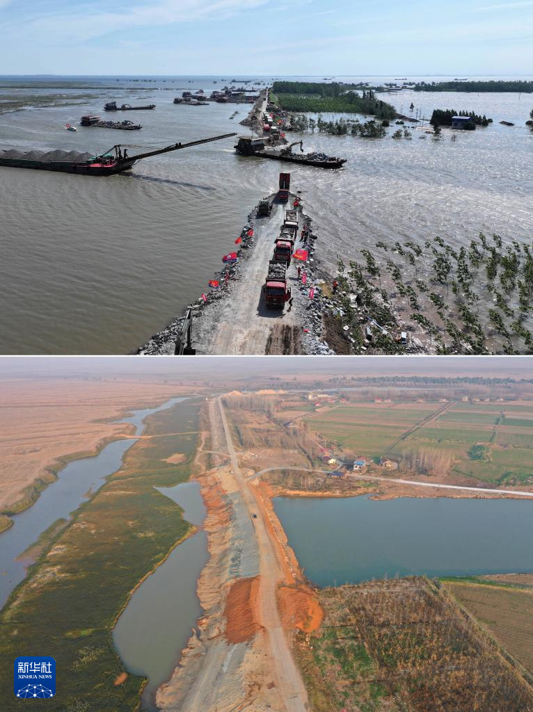 拼版照片:上图为7月8日拍摄的湖南省岳阳市华容县团洲垸洞庭湖大堤决口现场,抢险队伍在进行堵口作业(无人机照片);下图为12月18日拍摄的团洲垸洞庭湖大堤(无人机照片)。今年7月,团洲乡团洲垸洞庭湖一线堤防发生决口,团洲乡绝大部分被淹。