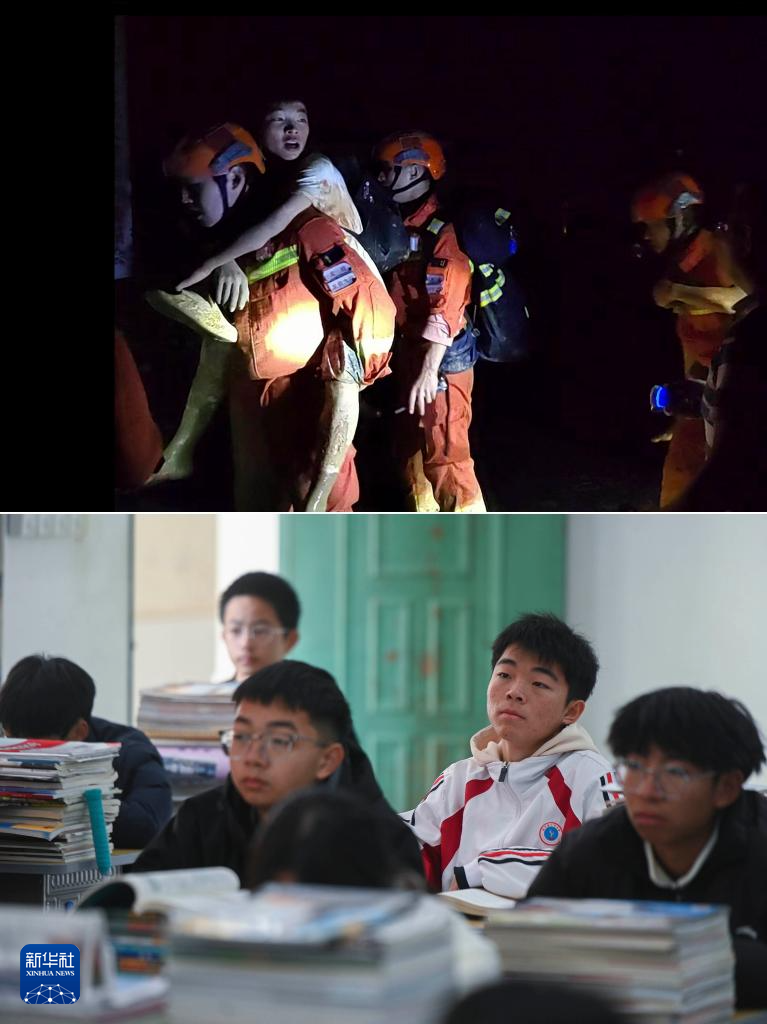 拼版照片:上图为6月17日福建森林消防总队龙岩支队队员背着龙岩市武平县中赤镇学生林荣浩去参加中考;下图为12月17日,林荣浩(右二)在武平县十方中学上课。今年6月,中赤镇遭遇特大暴雨,7个村近9000人受灾。