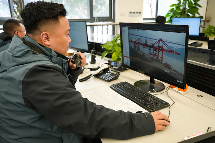 大年初一,重庆果园港集装箱码头依旧繁忙。多艘集装箱船舶停靠在码头,桥吊起起落落,卡车在堆场来回穿梭。在生产调度指挥中心,调度员耿杰和同事们正全神贯注地盯着屏幕,有序地调度指挥着码头的运转。