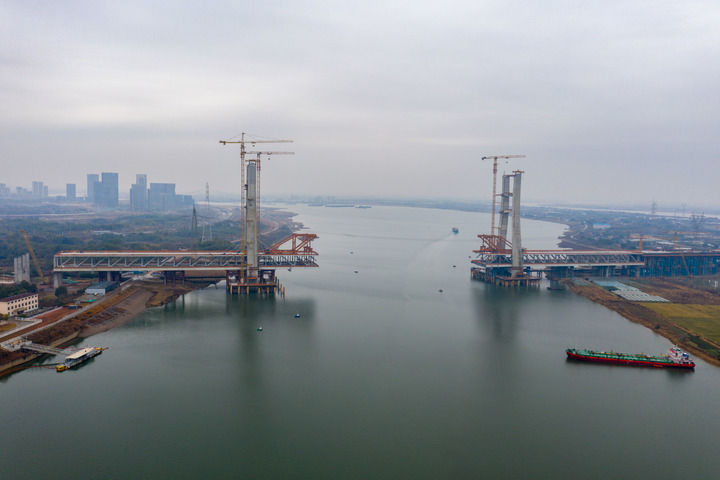 这是1月31日拍摄的昌九高铁南昌扬子洲赣江公铁大桥(西支)施工现场(无人机照片)。新华社记者 郭杰文 摄