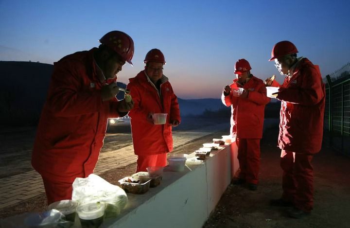 1月28日,长庆油田第二采油厂抢险队员在井场吃了一顿特殊的“年夜饭”。新华社发