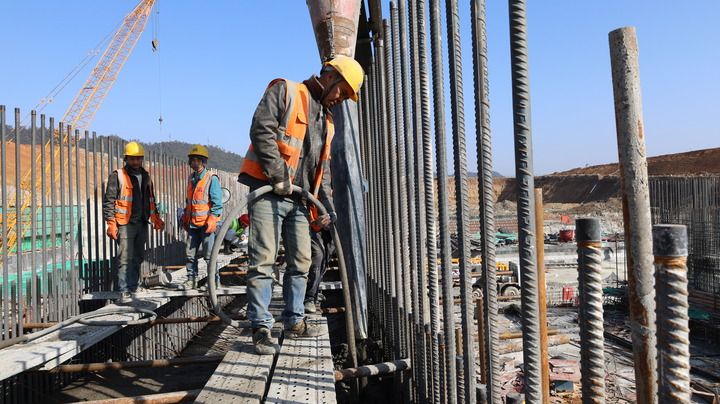 1月28日,工人在江西省景德镇市乐平水利枢纽工程建设现场施工。新华社发(贺蔚安 摄)