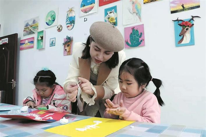 江南娣是五师八十四团职工子女。2017年,在外打工多年的她回到团场,当时正赶上团场征集前往南疆支教人员,美术专业毕业的她便报了名。从当年8月至次年7月,江南娣在阿图什市阿扎克乡兰杆幼儿园支教,并被评为优秀支教老师。支教回来后,江南娣便自主创业,开办了小鹿工作室,经营服饰售卖、少数民族服饰租赁及婚庆化妆等业务,有时还承接为顾客订制手工艺品。每到周末和假期,她还开设了幼儿绘画课。