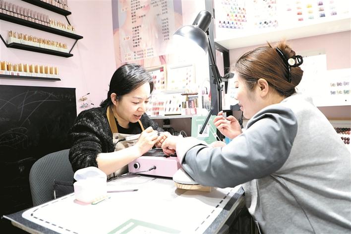 3月3日,在十二师三坪农场希芸美甲美睫店,店主马雪娇(左)正在给顾客做指甲。兵团日报常驻记者 冯晓玲 摄