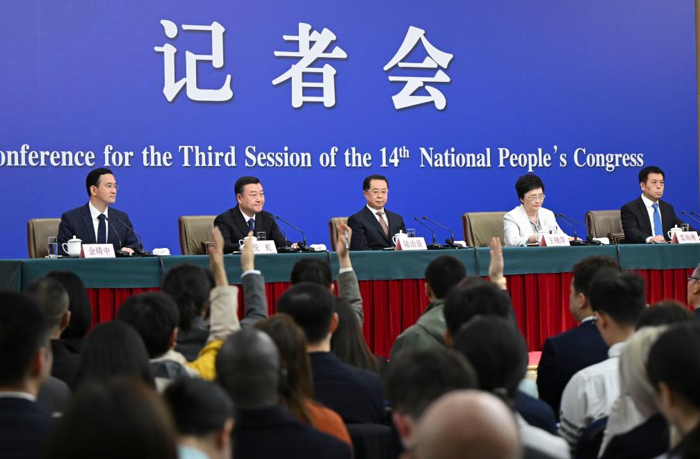 3月9日,十四届全国人大三次会议在北京梅地亚中心新闻发布厅举行记者会。民政部部长陆治原、人力资源和社会保障部部长王晓萍、住房和城乡建设部部长倪虹、国家卫生健康委员会主任雷海潮就民政、就业和社会保障、住房、卫生健康等相关问题回答中外记者提问。新华社记者 吕帅 摄