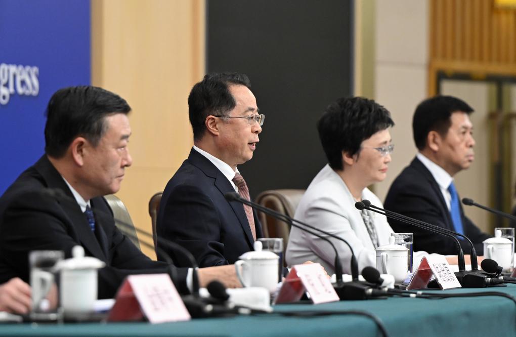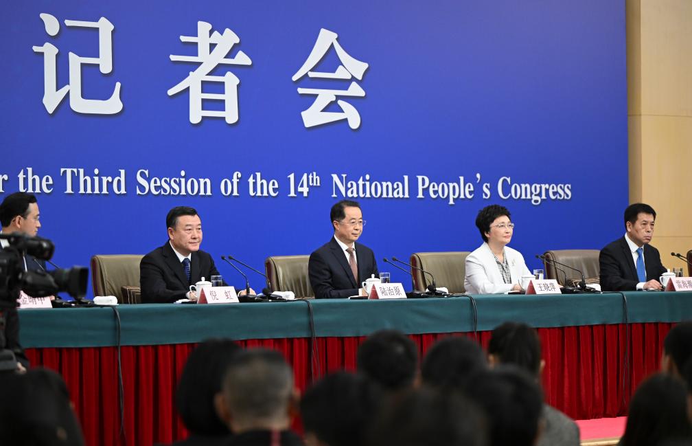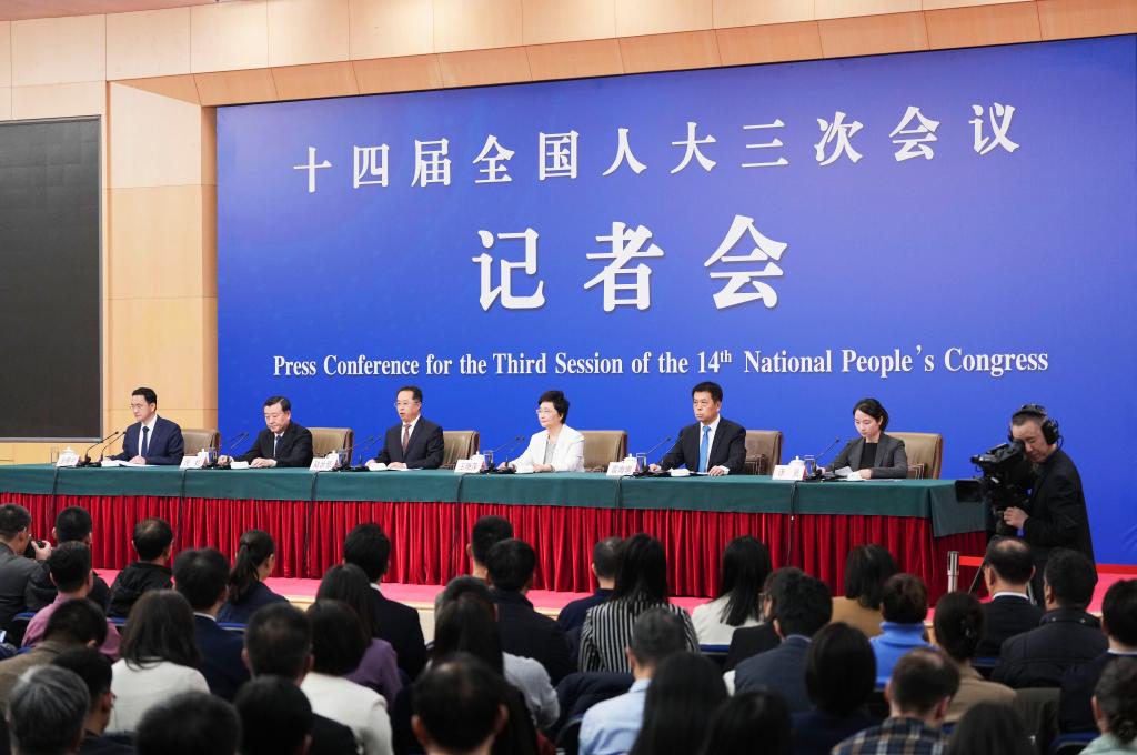3月9日,十四届全国人大三次会议在北京梅地亚中心新闻发布厅举行记者会。民政部部长陆治原、人力资源和社会保障部部长王晓萍、住房和城乡建设部部长倪虹、国家卫生健康委员会主任雷海潮就民政、就业和社会保障、住房、卫生健康等相关问题回答中外记者提问。新华社记者 胥冰洁 摄