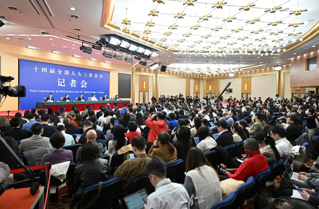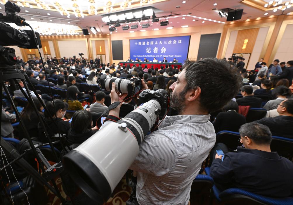 3月9日,十四届全国人大三次会议在北京梅地亚中心新闻发布厅举行记者会。民政部部长陆治原、人力资源和社会保障部部长王晓萍、住房和城乡建设部部长倪虹、国家卫生健康委员会主任雷海潮就民政、就业和社会保障、住房、卫生健康等相关问题回答中外记者提问。这是记者在现场采访拍摄。新华社记者 胥冰洁 摄