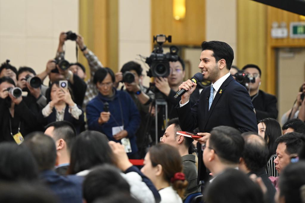 3月9日,十四届全国人大三次会议在北京梅地亚中心新闻发布厅举行记者会。民政部部长陆治原、人力资源和社会保障部部长王晓萍、住房和城乡建设部部长倪虹、国家卫生健康委员会主任雷海潮就民政、就业和社会保障、住房、卫生健康等相关问题回答中外记者提问。这是记者在提问。新华社记者 胥冰洁 摄