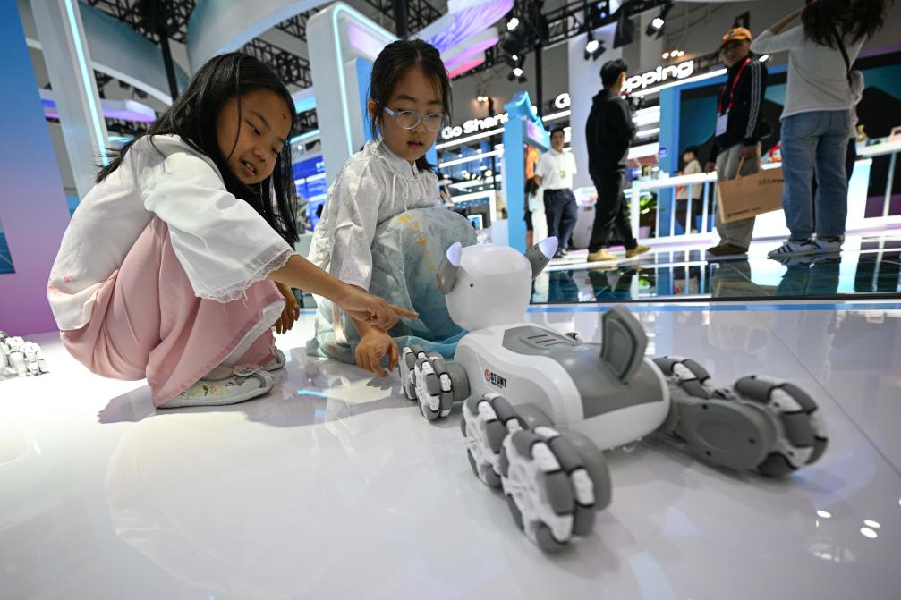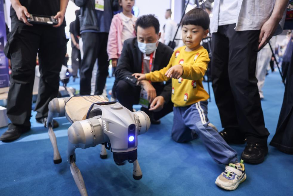 4月13日,在第五届消博会现场,小朋友和宇树科技展示的机器狗互动。新华社记者 杨冠宇 摄