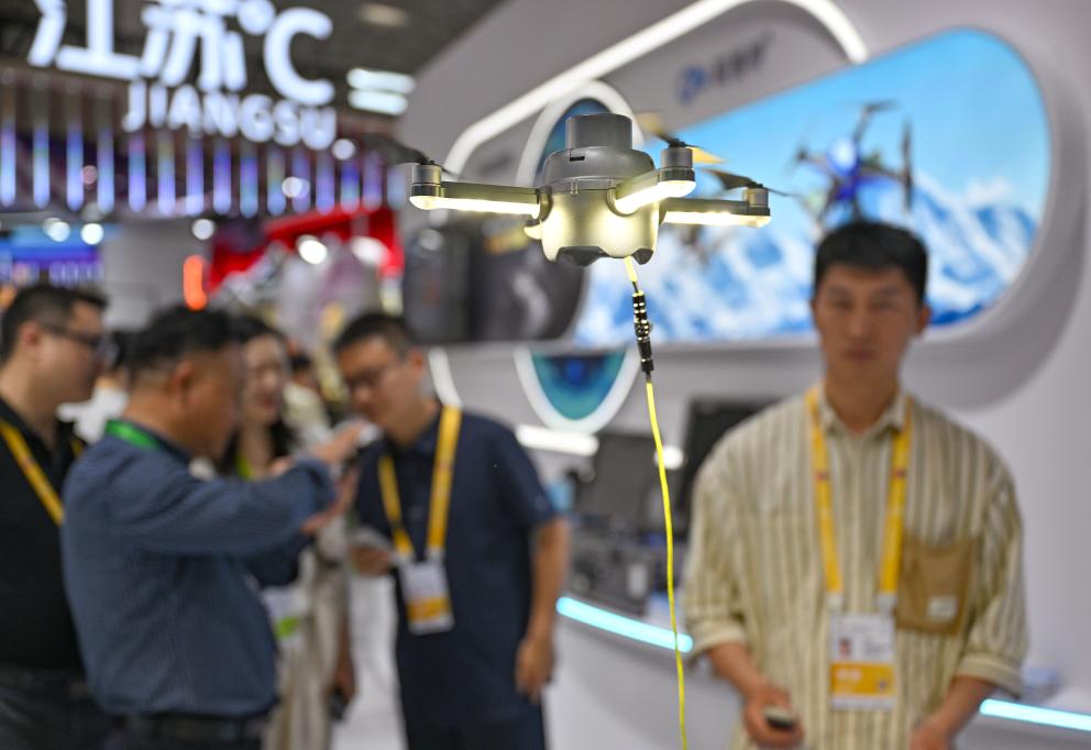 4月13日,展商在消博会现场展示一款系留照明无人机。新华社记者 郭程 摄