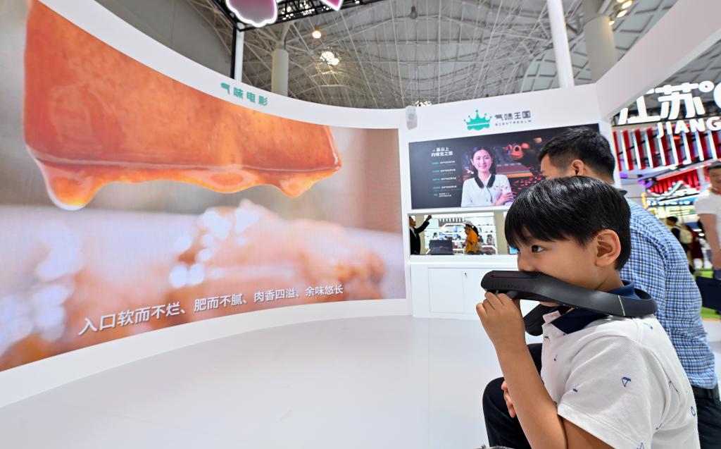 4月13日,观众在消博会现场体验气味电影。新华社记者 郭程 摄
