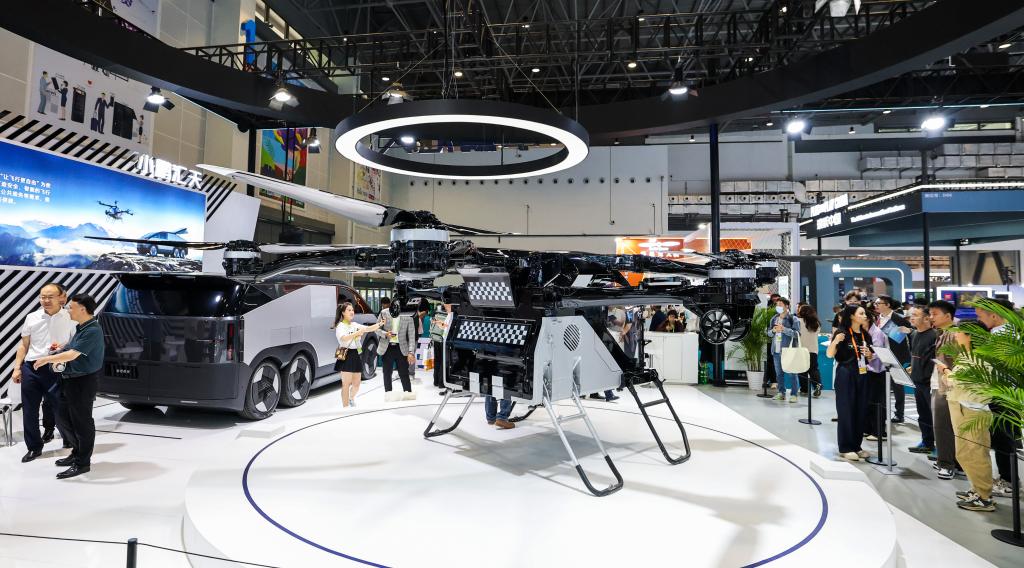 4月13日,在第五届消博会现场,观众在参观小鹏汇天展出的“陆地航母”。新华社记者 杨冠宇 摄