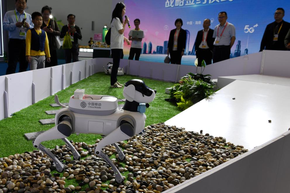 4月13日,在第五届中国国际消费品博览会中国移动展台,工作人员在演示机器狗模拟给户外活动的老年人送药的场景。新华社记者 孙笑天 摄