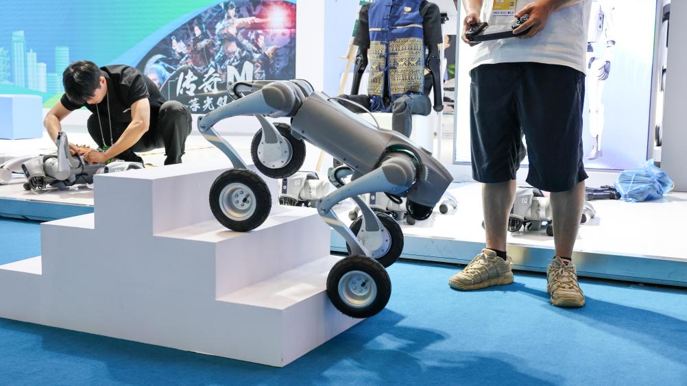 这是4月13日在第五届消博会现场拍摄的宇树科技展示的机器狗在上下台阶。新华社记者 杨冠宇 摄