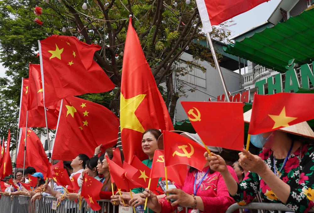 欢迎仪式后,习近平和苏林一同步行前往越共中央驻地举行会谈。沿途数百名越南民众挥舞两党两国旗帜,对习近平表示最热烈的欢迎。习近平向欢迎人群挥手致意。