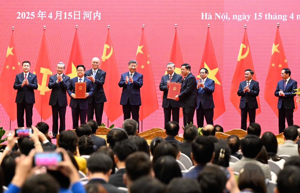 会谈后,两党总书记共同见证中越双方签署的45份双边合作文本展示,涵盖互联互通、人工智能、海关检验检疫、农产品贸易、文化和体育、民生、人力资源开发、媒体等领域。
