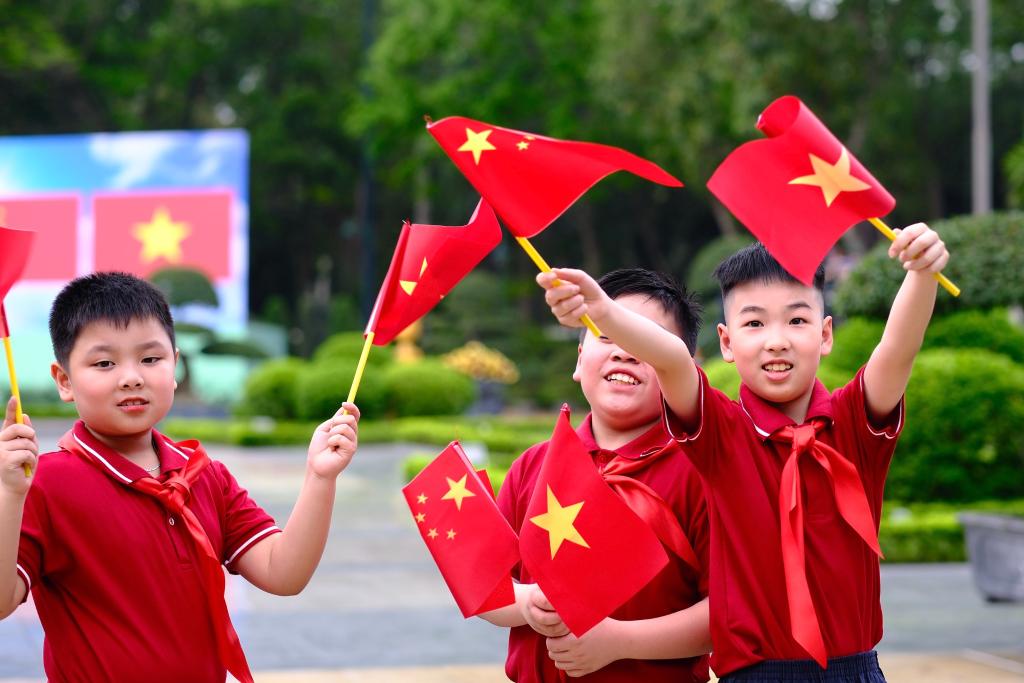 主席府广场上,五星红旗同金星红旗迎风飘扬,200多名越南少年儿童挥舞旗帜,热烈欢迎习近平到访。