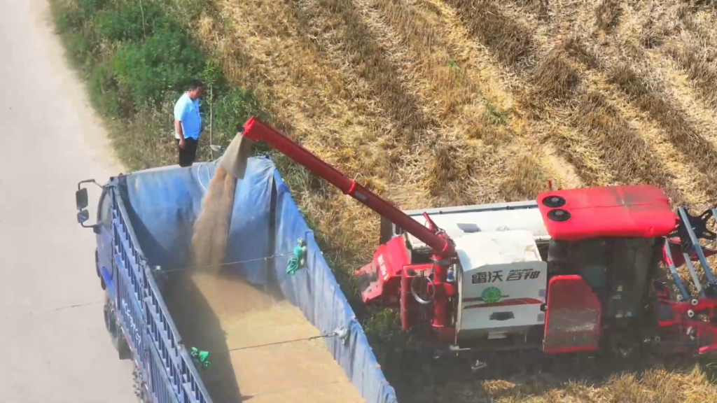 在河南省南阳邓州市腰店镇,智能收割机正在进行收割作业。新华社记者 姜亮、尚昆仑 摄