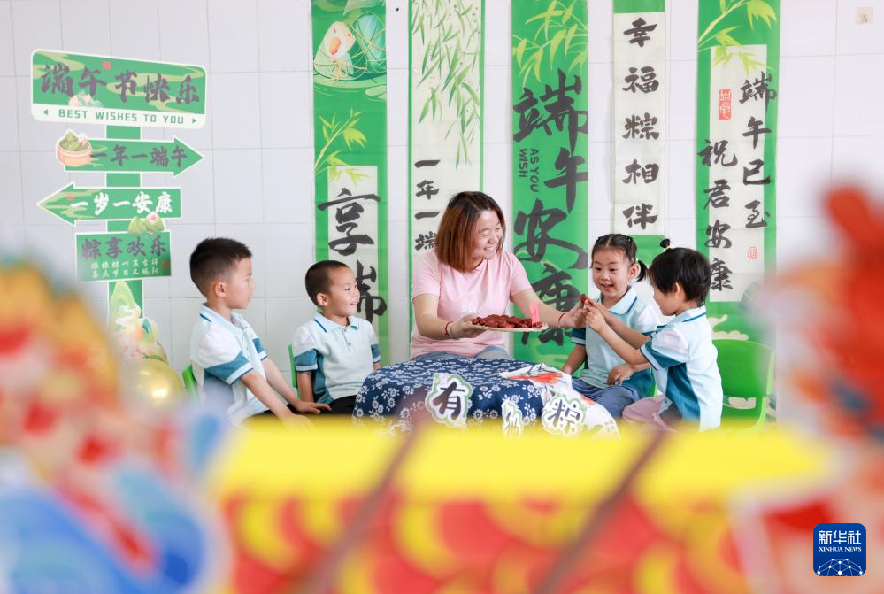 5月28日,在山东省荣成市第二实验幼儿园,志愿者与孩子们一起制作粽子。新华社发(李信君 摄)