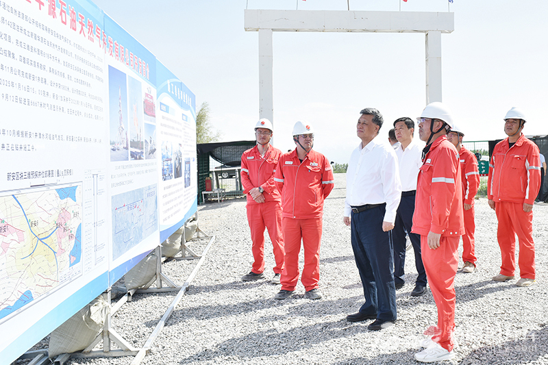 6月1日,自治区党委书记、兵团党委第一书记、第一政委马兴瑞在位于石河子市的新疆华源石油天然气开发有限公司新安1井现场,详细了解区块油气资源蕴藏、探采进度、项目投资等情况。王艳 摄