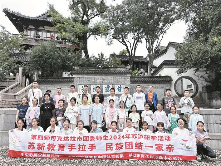 镇江市对口支援四师前方工作组组织四师可克达拉市的学生们参加在镇江举办的“石榴籽一家亲”少先队夏令营和研学活动,图为学生们在研学活动期间合影留念(资料图片)。李广啸 摄