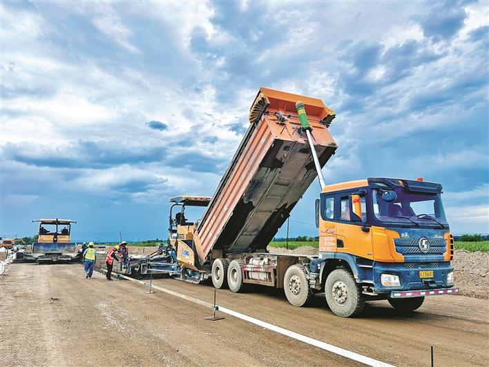 在兵团建工水电集团市政路桥公司九师白杨市三批次一标项目纵九路,工人在进行水稳铺设工作(摄于6月25日)。王明浩 摄