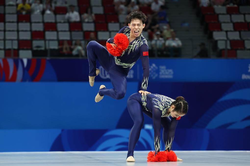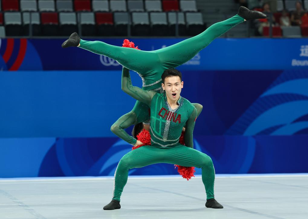 中国队选手马科唯/林奕航组合在啦啦操双人花球比赛中。新华社记者 梁旭 摄