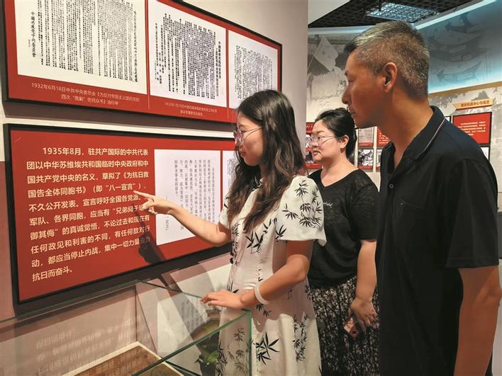 8月14日,六师五家渠市市民在参观“穿越硝烟的纸弹——山西抗战时期红色传单标语展”中展出的“八一宣言”。周婷婷 摄