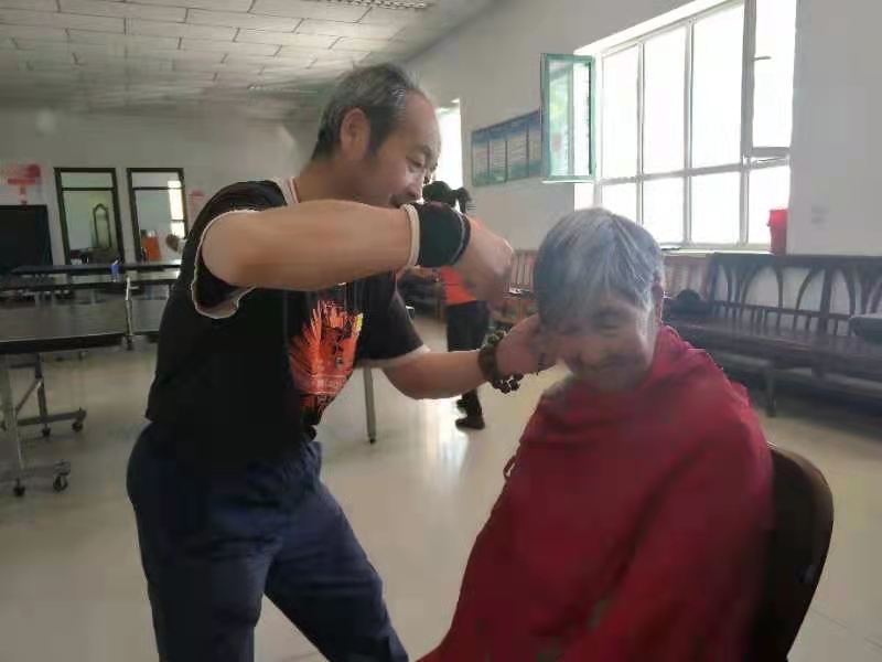 黄金井义务为养老院老人义务理发。