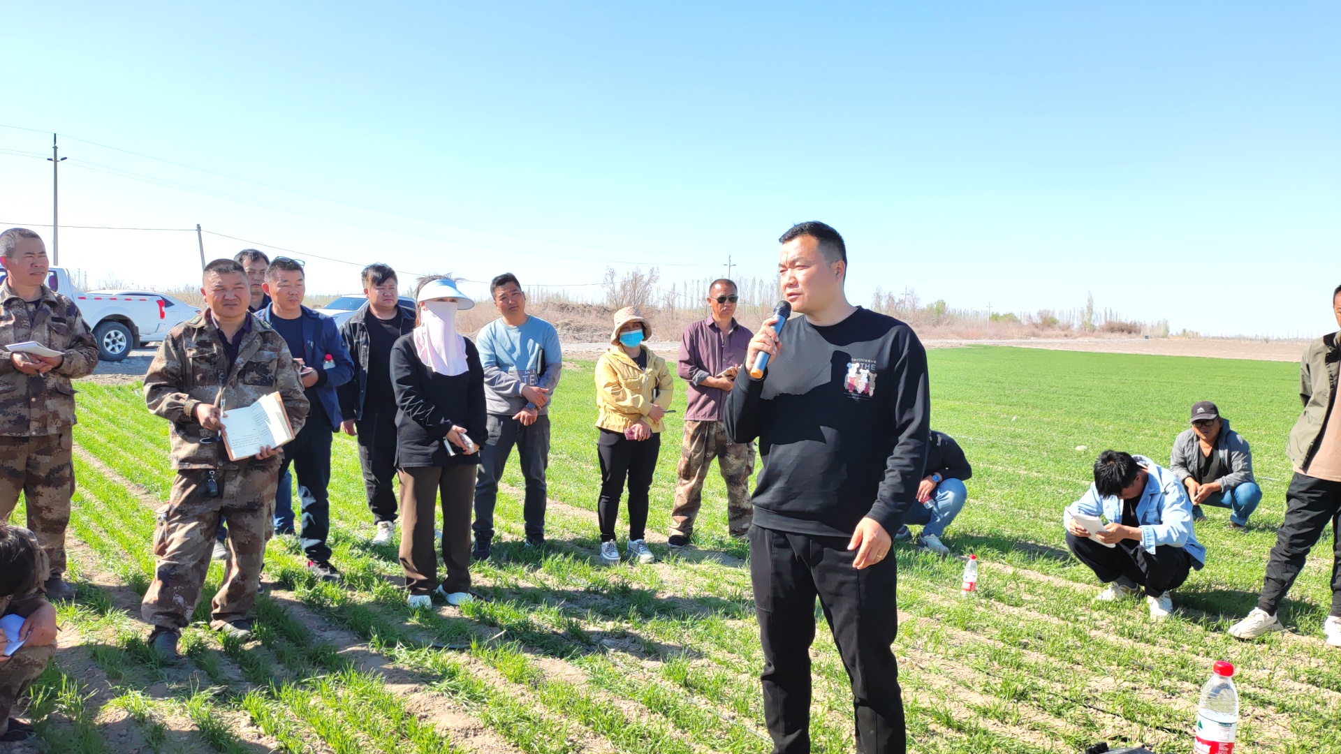 2024年3月27日,陈江鲁在新疆阿克陶县指导冬小麦种植户化控除草(人群中间身穿黑色衣服、手拿黄色瓶子的是陈江鲁)。