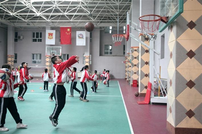 9月16日,五家渠第一小学体育馆内,学生们练习投篮。杜仪 朱小丽 摄