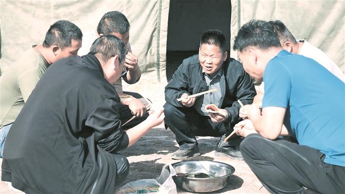 在临时搭建的帐篷前,魏九龙(正面)和连队“两委”成员、职工代表一边吃饭,一边商量水稻采收前准备事宜(资料图片)。魏九龙 提供