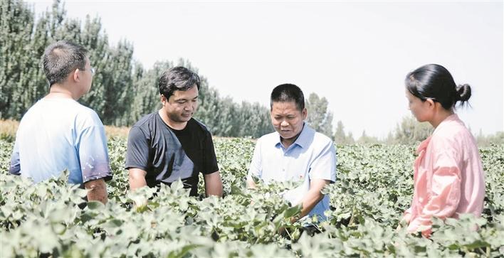 魏九龙(右二)为阿克苏市柳源镇天海村村民传授棉花管理技术(资料图片)。魏九龙 提供
