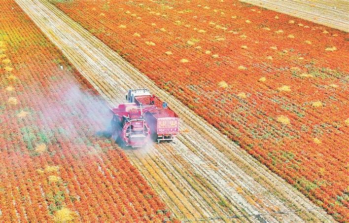 10月8日,在二师二十二团三连色素辣椒种植基地,大型辣椒收割机进行采收作业。眼下,二十二团种植的8.8万亩色素辣椒迎来丰收,田间地头一派繁忙景象。近年来,该团大力推广辣椒规模化种植、机械化作业,采收效率大幅提升,为农业增效、职工群众增收奠定了坚实基础。焦栋栋 摄
