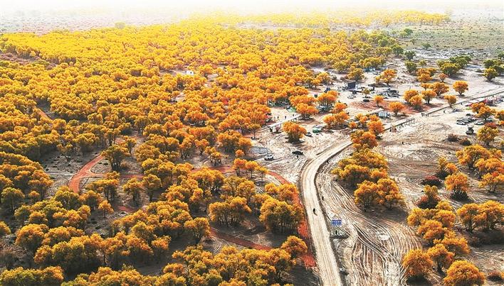 一师五团和阿克苏地区温宿县共同打造的萨叶科普胡杨林景区(摄于10月17日)。10月以来,当地大面积天然胡杨林由绿泛黄,金色胡杨与蓝天白云相映成景,吸引了众多游客前来观光游玩,感受自然生态的无限魅力。孙国权 摄