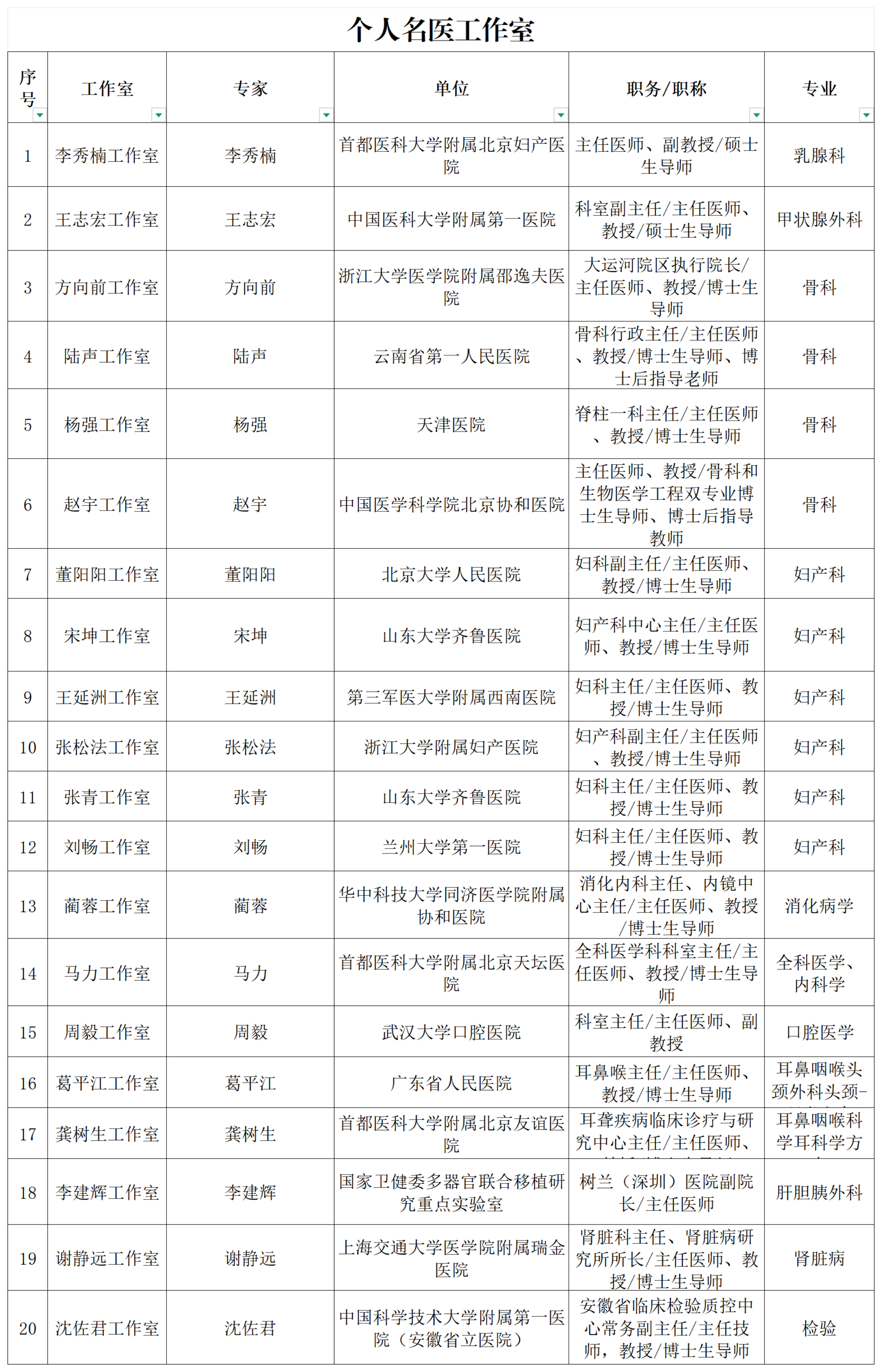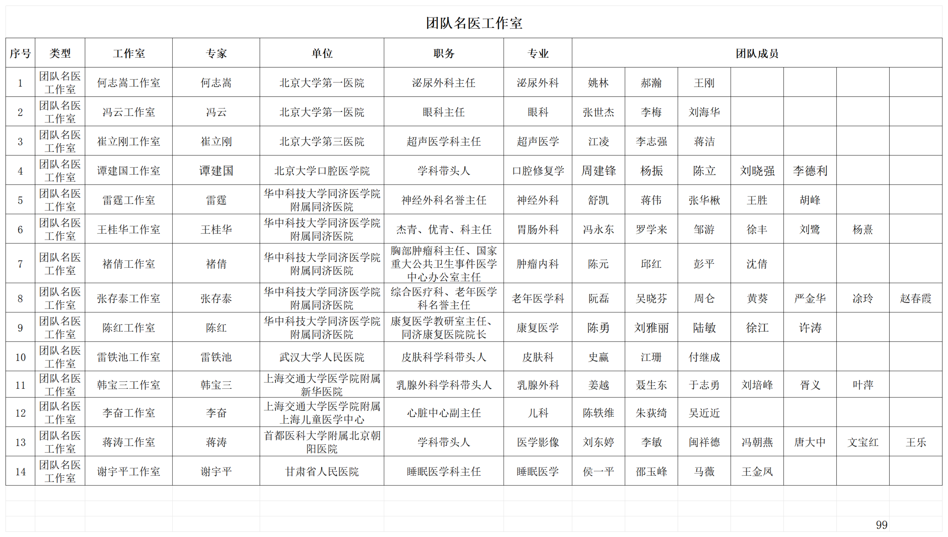 据悉,此次挂牌的34个全国名医工作室涵盖泌尿外科、眼科、肿瘤科等多个临床与医技专业,汇聚北京、上海、武汉等国内顶尖医疗机构专家99名。