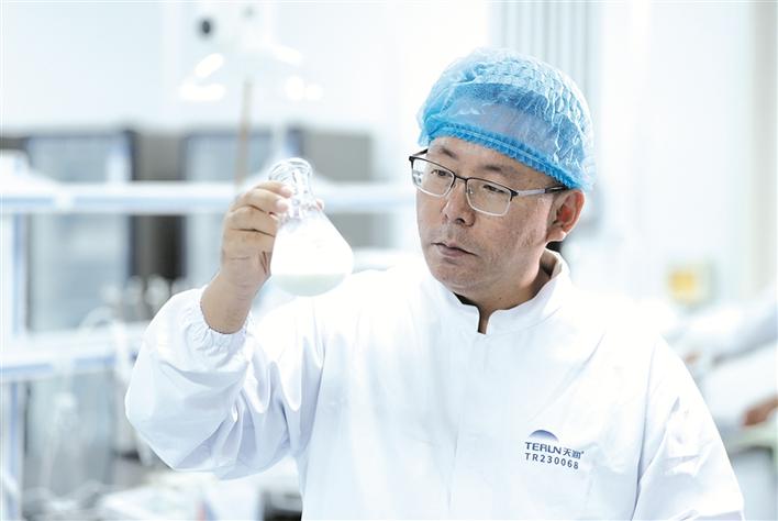 刘朋龙在化验室检测产品质量(摄于9月17日)。高正帅 摄 刘朋龙 人物名片 刘朋龙,新疆天润乳业股份有限公司总工程师。 匠心感言 人可以平凡,但不能平庸,用心将事做到极致,只为不留遗憾。